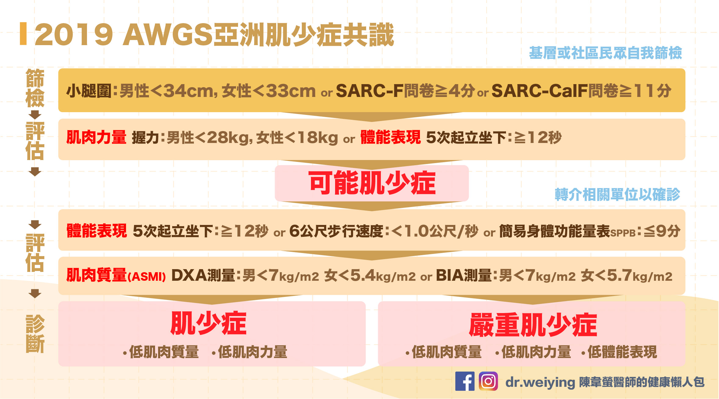 亞洲肌少症工作小組(American Working Groups for Sarcopenia;AWGS)的2019更新共識中有提供指引給臨床工作的醫護人員,以下整理針對基層或一般社區的民眾,從篩選、評估到診斷的流程。