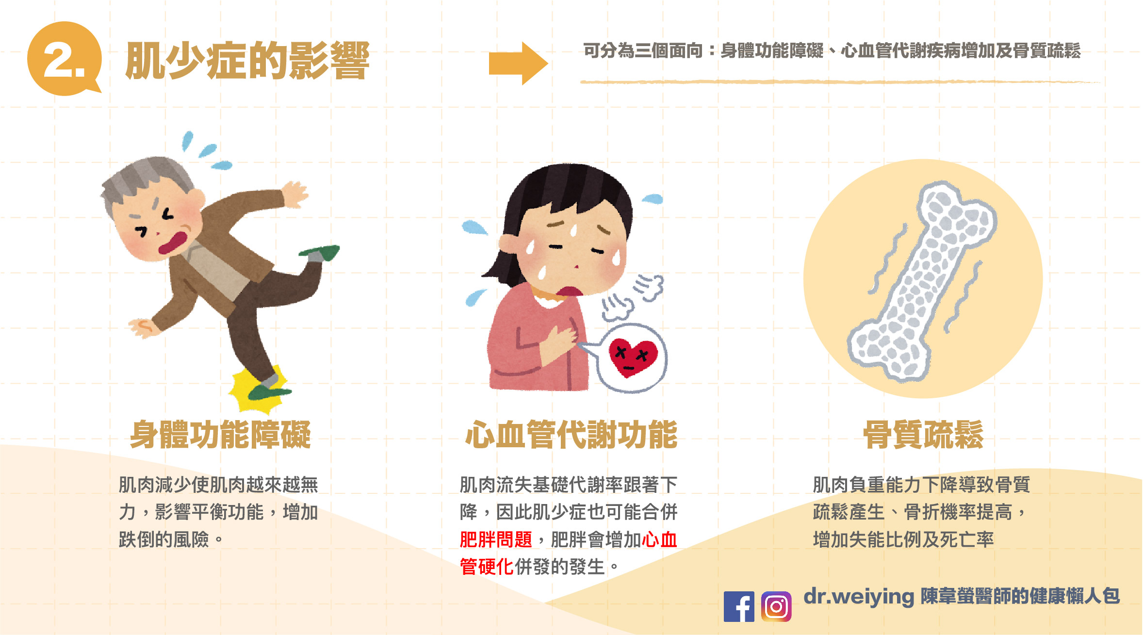 1.身體功能:肌肉減少會使肌肉越來越無力,影響平衡功能,增加跌倒的風險,此外,無力會降低運動及活動意願,如此惡性循環,最後身體就會衰落而逐漸失能了。