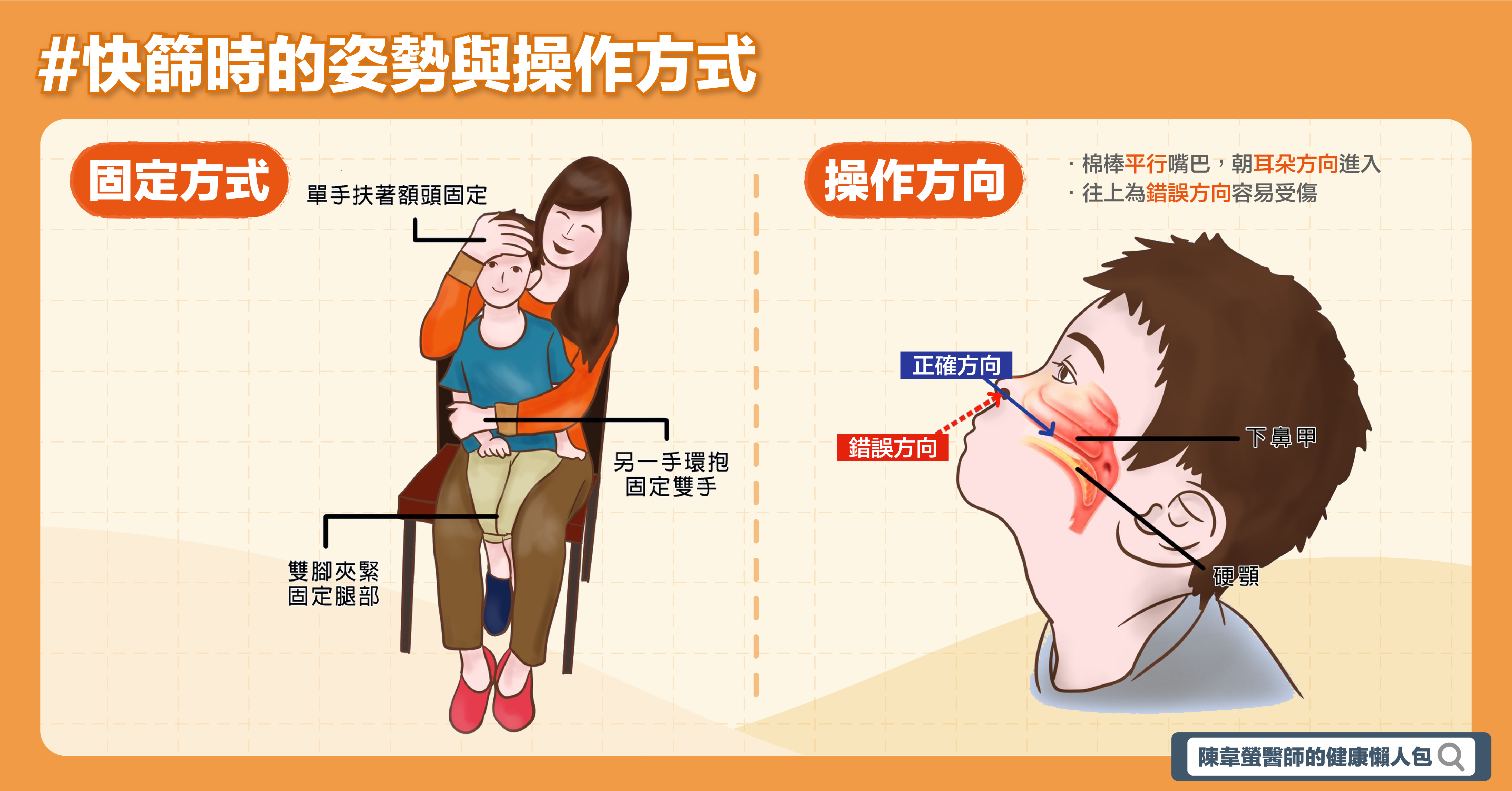 若只有單人操作則可考慮用第二種方法,也就是刷牙常用的十字固定法,但第二個方法的角度跟平常操作快篩的方向是相反的,再加上固定腳部會比較困難,可以嘗試用在年紀比較小的孩子,若體型比較大的小孩無法好好固定反而可能受傷。