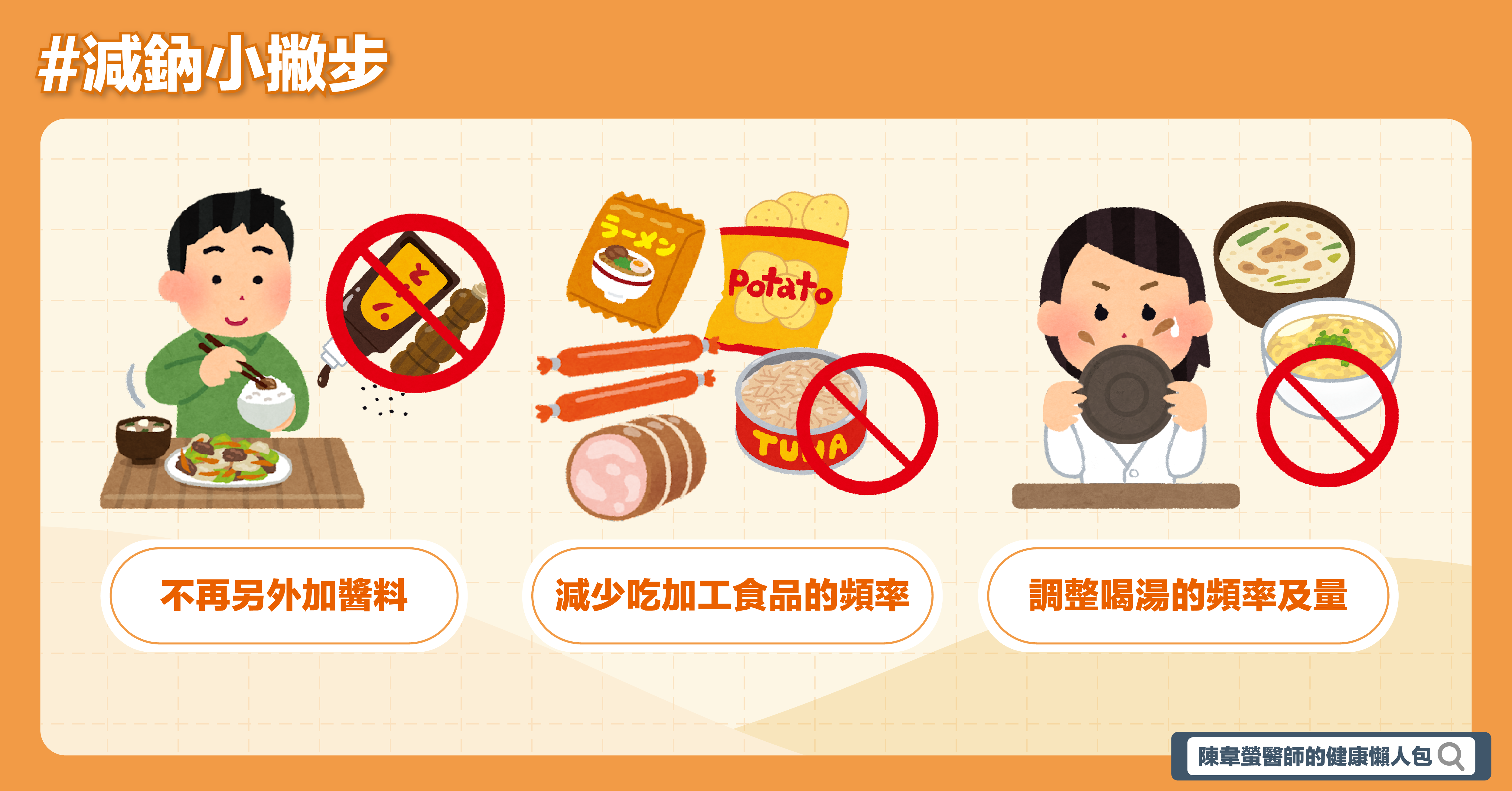 我想看了大家就算知道數字是多少,實際要實行卻非常困難,第一是現代人大多為外食,除非全部吃的食物都有營養標示,不然要知道它裡面實際有多少鈉含量是非常困難的;第二是就算都自己在家裡做,本身不是對食物非常了解的人也沒辦法確實定量加進去的東西究竟有多少。精密計算鈉總攝取量是困難的,但有一些大重點只要能掌握住一樣也能減鈉成功,這邊陳醫師給大家3個建議能幫助減低至少八成以上不必要的鈉含量: