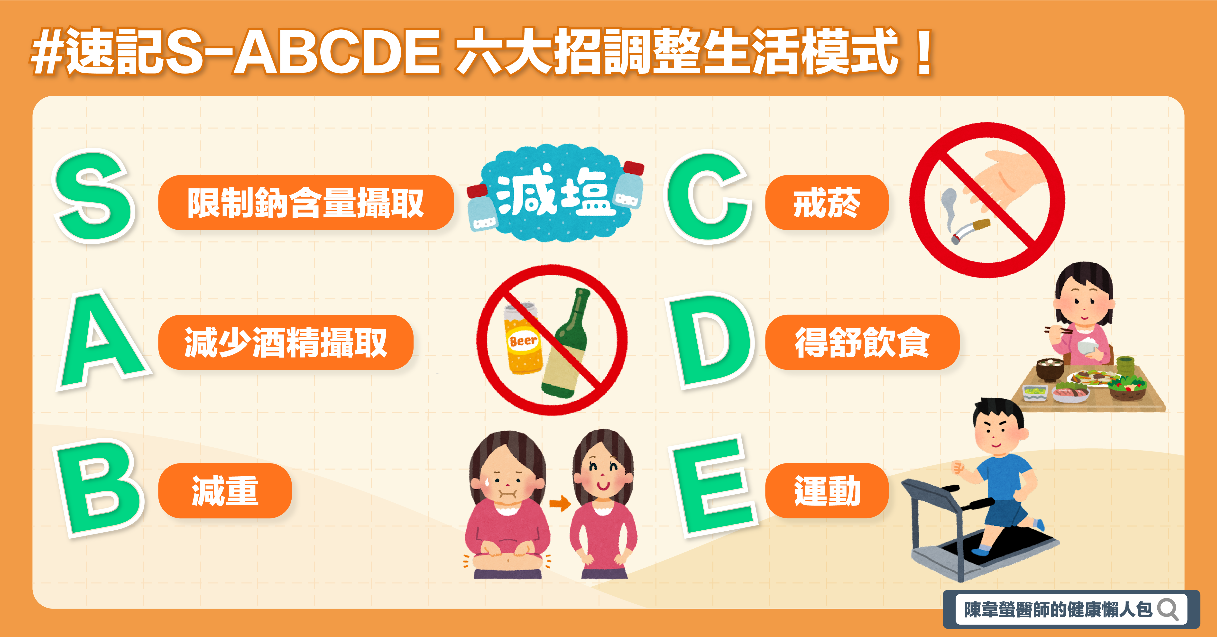 以上生活模式調整對發現高血壓前期或是已經有高血壓正在服用藥物的患者都有幫助,從英文開頭可以將這6點速記成S-ABCDE,台灣心臟科醫學會及高血壓學會2017年制定的高血壓治療指引,將這些飲食行為的改變對血壓改善的效果整理如下: