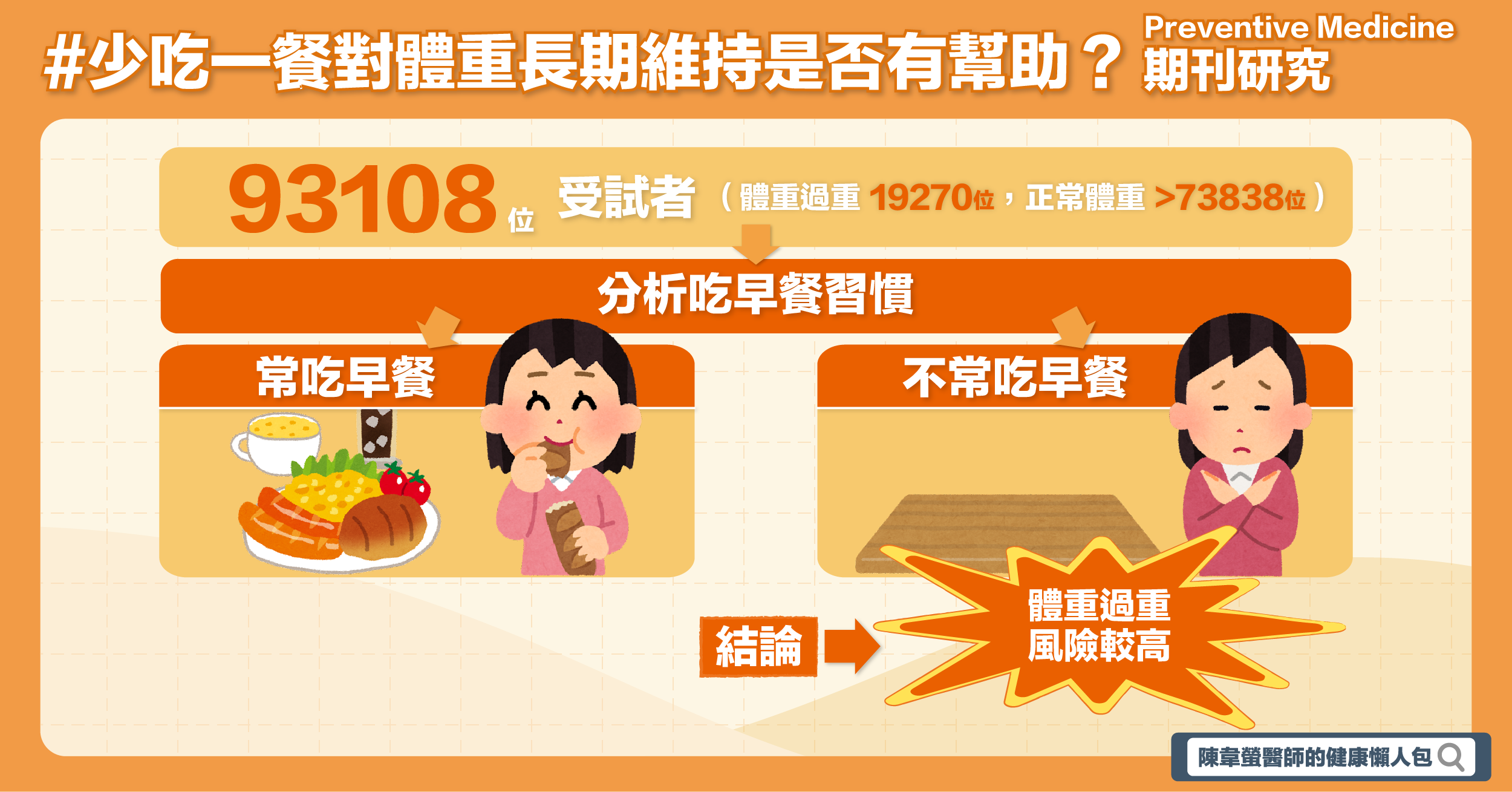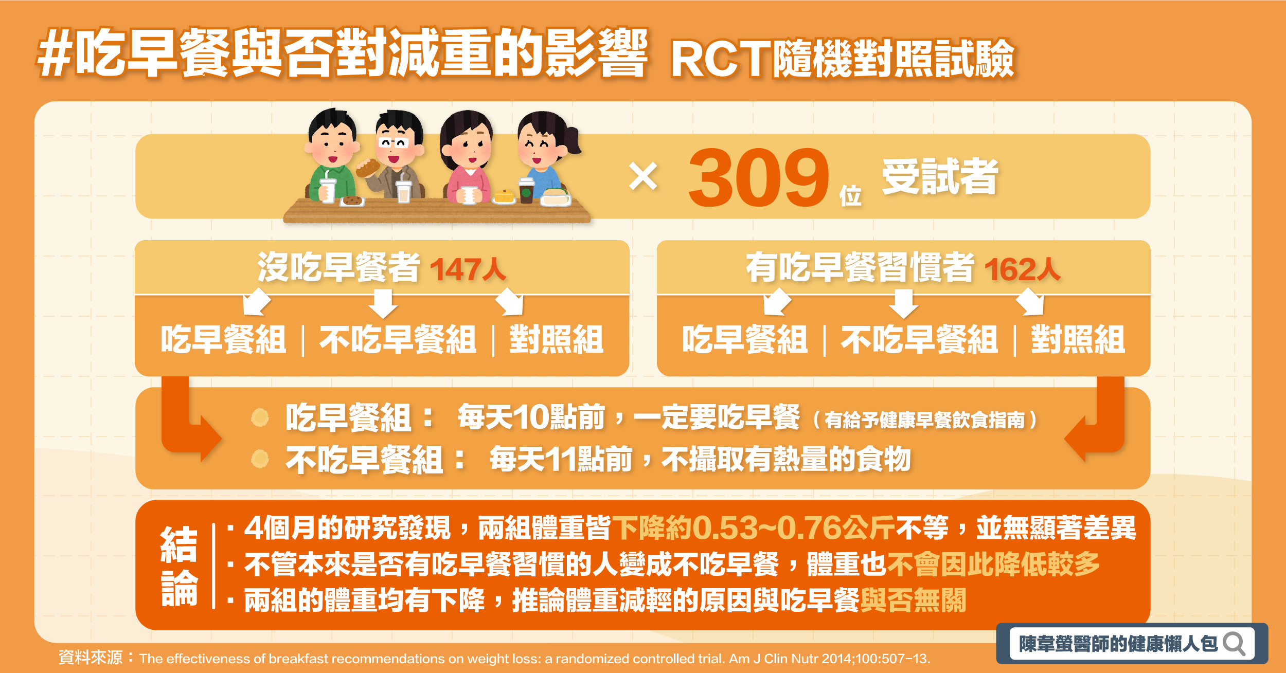 這邊有人可能會問,第一個研究分明說吃不吃早餐與減重成果無關,怎麼第二個研究就打臉說有吃早餐習慣者體重比較正常呢?其實陳醫師來看是完全沒有矛盾且非常合理的!因為兩個討論的面向不同,第一個研究是在探討減重方式,而第二個說的是長期的體重管理。