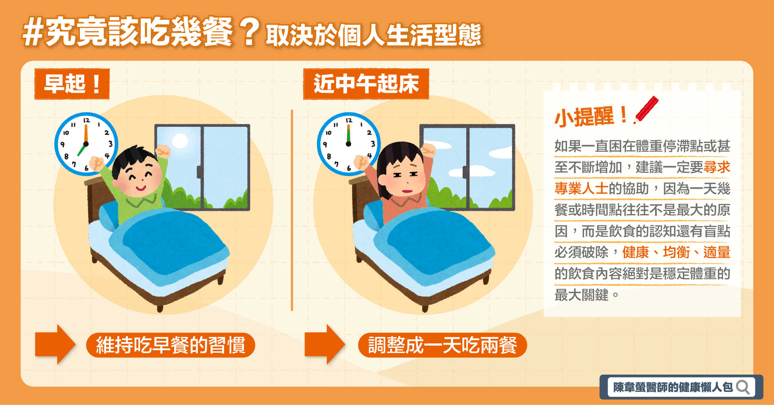 最後總結,若你是一個正常作息、很早起床或是你的家庭是會一起吃早餐的,我建議還是維持吃早餐的習慣;如果你的生活型態是起床就接近中午了,早餐吃完沒多久就要吃午餐,也許可以考慮調整變成一天吃兩餐的形式從中來營造熱量赤字的出口。如果一直困在體重停滯點或甚至不斷再增加,建議一定要尋求專業人士的協助,因為一天幾餐或時間點往往不是最大的原因,而是飲食的認知還有盲點必須破除,健康、均衡、適量的飲食內容絕對是穩定體重的最大關鍵,與各位共勉之。