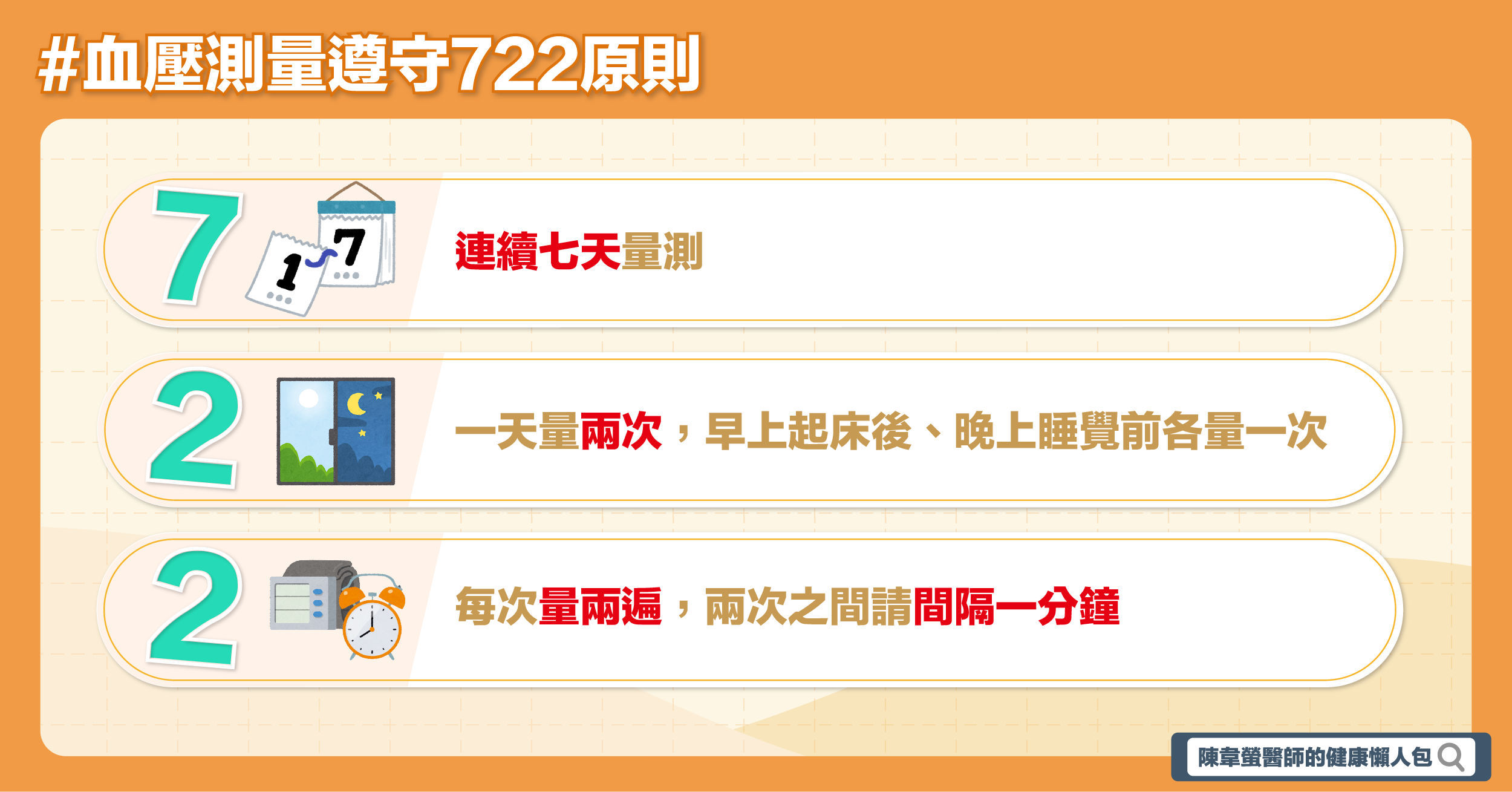 台灣高血壓學會一直以來持續推廣居家血壓量測,以下是722原則: