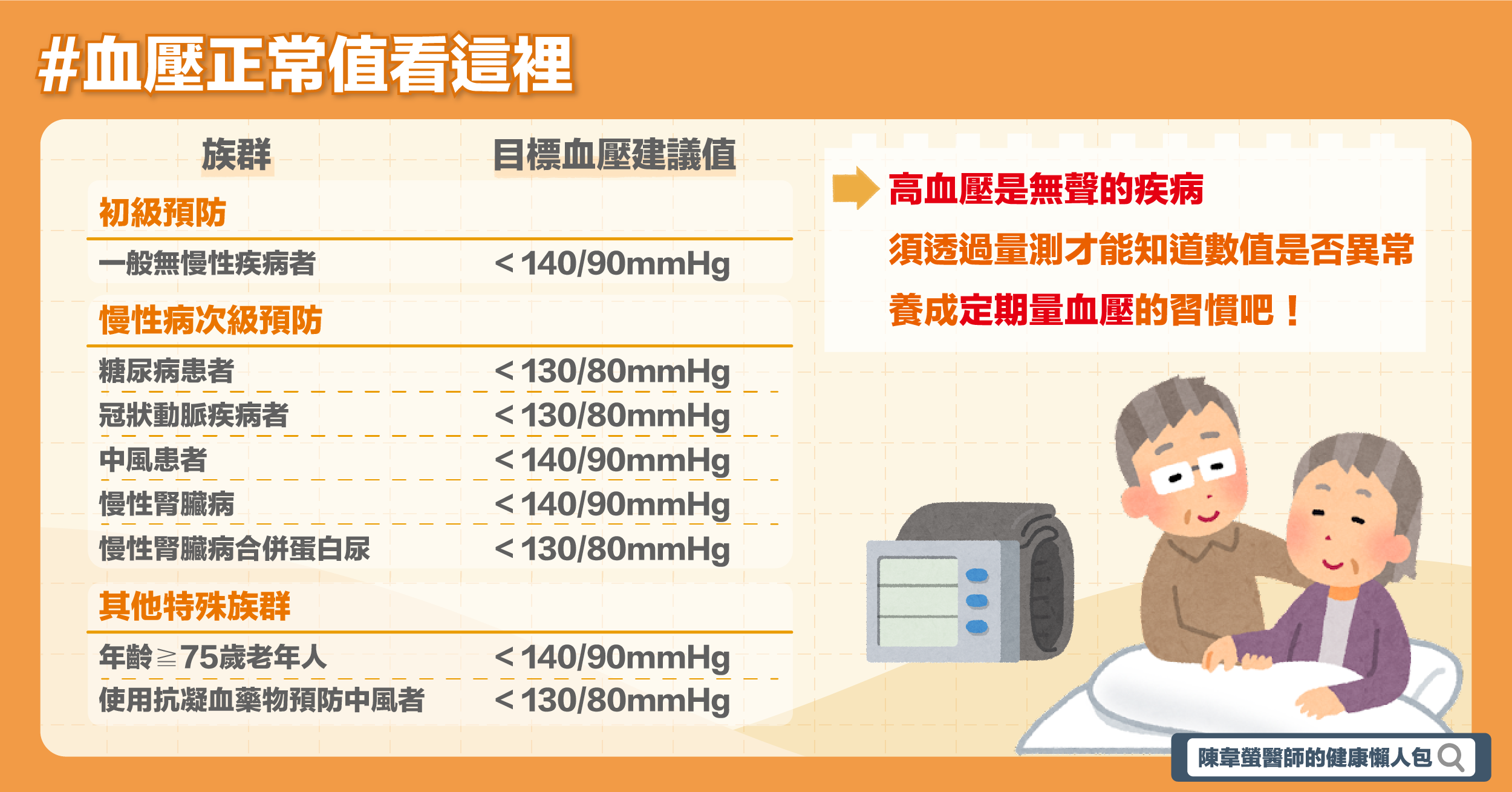 每個人需要治療的時機點會隨著個人狀況不同而有改變,年輕人的標準與老年人不同,有慢性病者與無病者也不會一樣,但最重要的是提醒大家了解自己的身體狀況,高血壓是無聲的疾病,必須透過量測才能知道數值是否異常,另外有服用慢性病藥物的人更要養成量血壓的習慣,這樣醫師才能替你做最完善的調整,2017年的是學會目前給出治療最新的建議,近期有訊息指出可能會做更新,若有進一步消息再整理分享給大家。