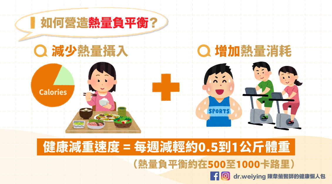 要產生熱量負平衡意即你消耗的熱量要多於你攝取的熱量,這樣聽起來好像是在說不論你創造出多大或多小的熱量負平衡,體重都可以下降,也就是說負平衡越大,能減下的體重越多,同理,若負平衡很小,體重可能下來一點點就停住了。我在減重門診中給過重或肥胖學員的建議,安全且有效率的減重速度在每週減輕約0.5到1公斤體重,要有這樣的速度,粗估每日創造出來的熱量負平衡約在500至1000卡路里。有了大觀念後,接下來就是如何有效實現熱量負平衡的狀態。