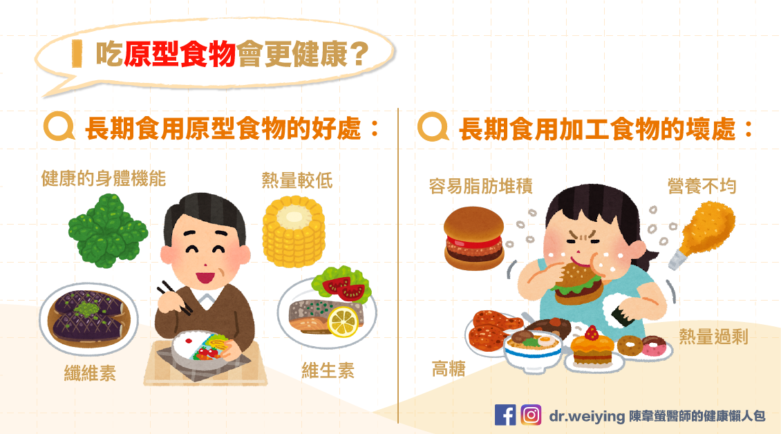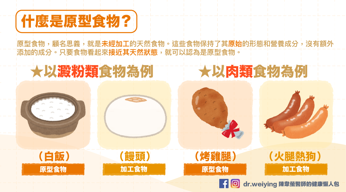 原型食物,顧名思義,就是未經加工的天然食物。這些食物保持了其原始的形態和營養成分,沒有額外添加的成分。要辨別什麼是原型食物,其實很簡單:只要食物看起來接近其天然狀態,就可以認為是原型食物。例如,米飯和饅頭都是澱粉類食物,但米飯保持了大米的天然形態,而饅頭則是經過多個加工的步驟,添加了各種成分,經過某些再製程後才生產出來,因此,米飯是原型食物,而饅頭則不是。同樣地,雞腿和香腸都是蛋白質來源,但雞腿保持了雞肉的原始形態,香腸則經過加工製成,因此,雞腿是原型食物,香腸則不是。陳醫師再更簡單告訴大家,當你要選擇的食物前,先想想它從動物或植物身上拿下來,是否是相同的樣子,如果是,基本上八九不離十它是原型食物,但如果它的外型已經與原本相去甚遠,我想就一定不是原型食物了。