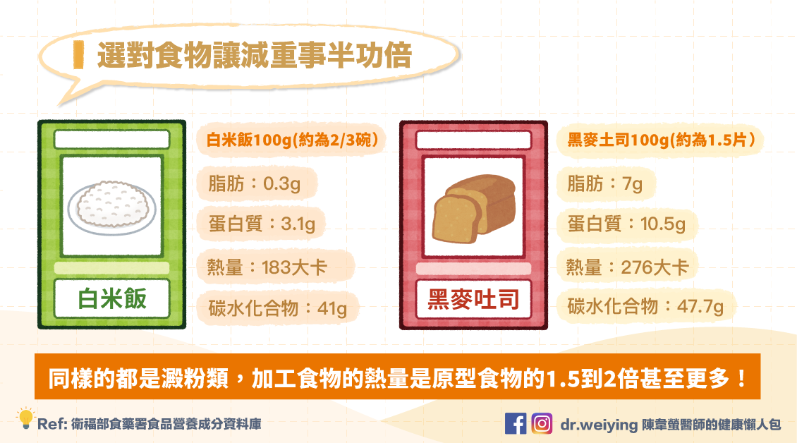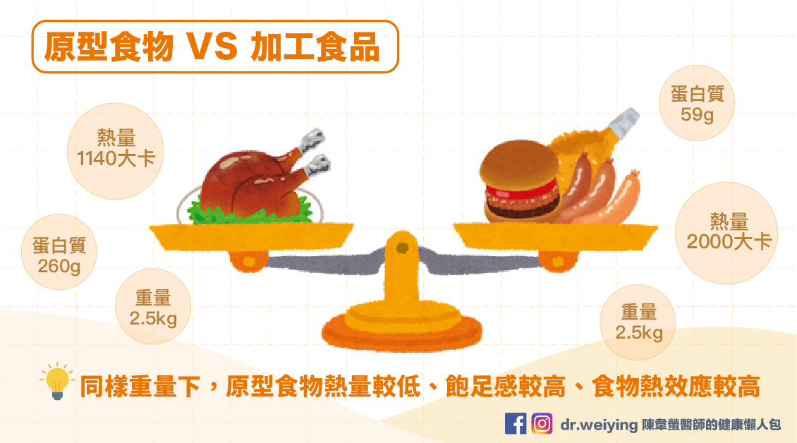 在診間中,常常遇到病患抱怨明明已經戒掉了飲料、糖果、餅乾、麵包等加工食品,而且三餐都自己煮,完全不外食,為什麼仍然無法減重?這是因為體重的管理不僅僅取決於食物的種類,還取決於每日攝取的總熱量。如果即使吃的是原型食物,但攝入的量超過了身體的需求,多餘的熱量仍然會轉化為脂肪堆積在體內,最後體重增加產生肥胖問題。